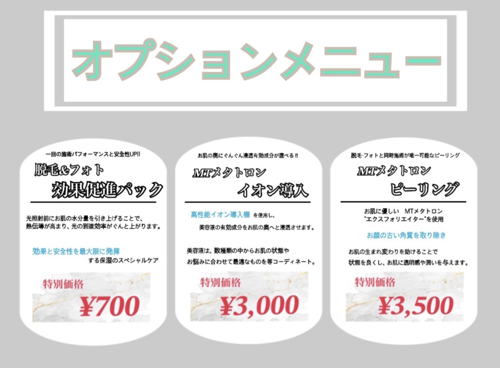 当店では、脱毛、美肌光フェイシャルなどをメインメニューとして取り扱っておりますが、
